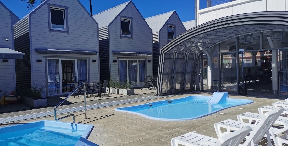 Przestronne nowoczesne domki usytuowane blisko morza, dostępny plac zabaw dla dzieci, basen na wyciągnięcie ręki.
